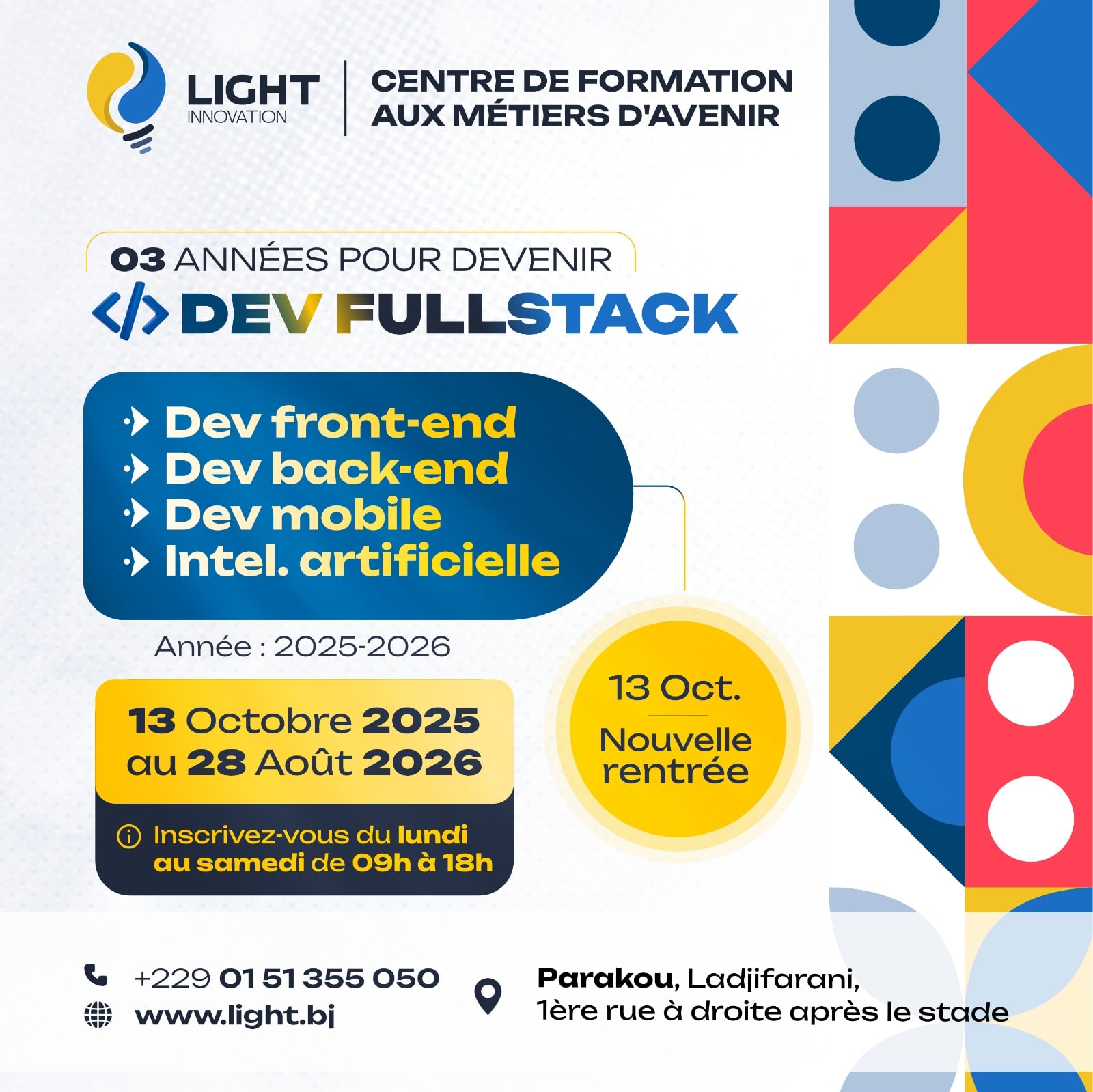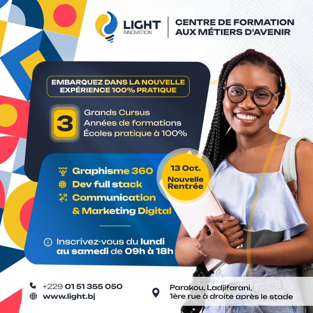 Ces notions ont été explorées lors d’un atelier pratique animé par Tairou Gobi, Développeur Full Stack, au sein de Light Innovation. Pour celles et ceux qui souhaitent approfondir et se professionnaliser dans les métiers du digital, le Centre de formation aux Métiers d’Avenir – Light Innovation ouvrira sa prochaine rentrée en octobre 2025.